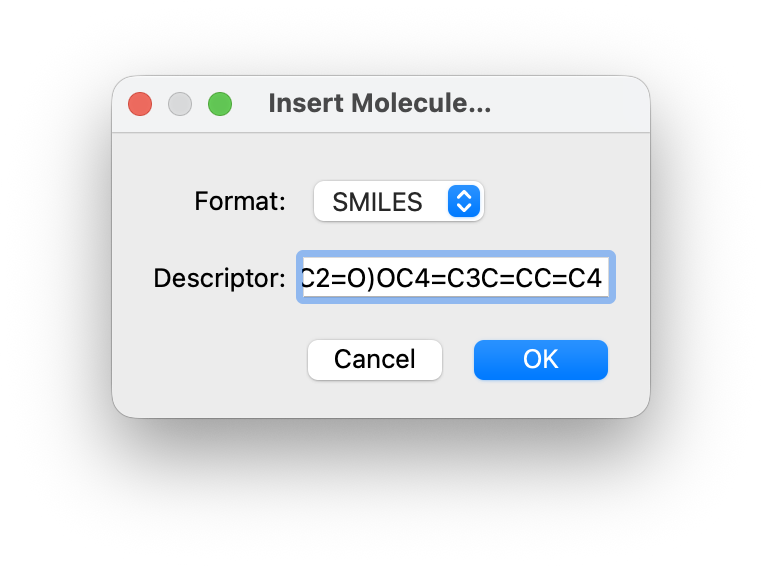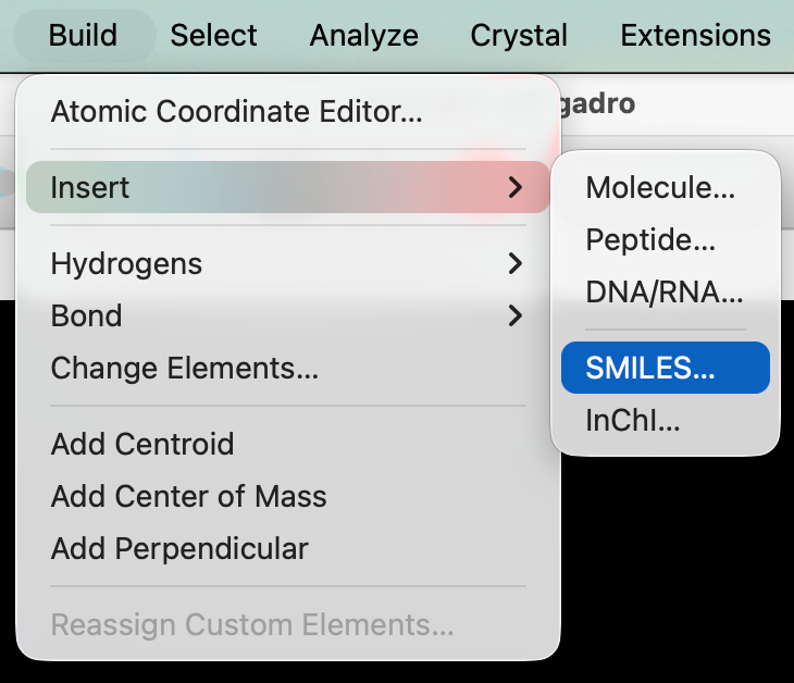 Under the “Build” menu, hold your cursor over “Insert”, and select “SMILES…”.