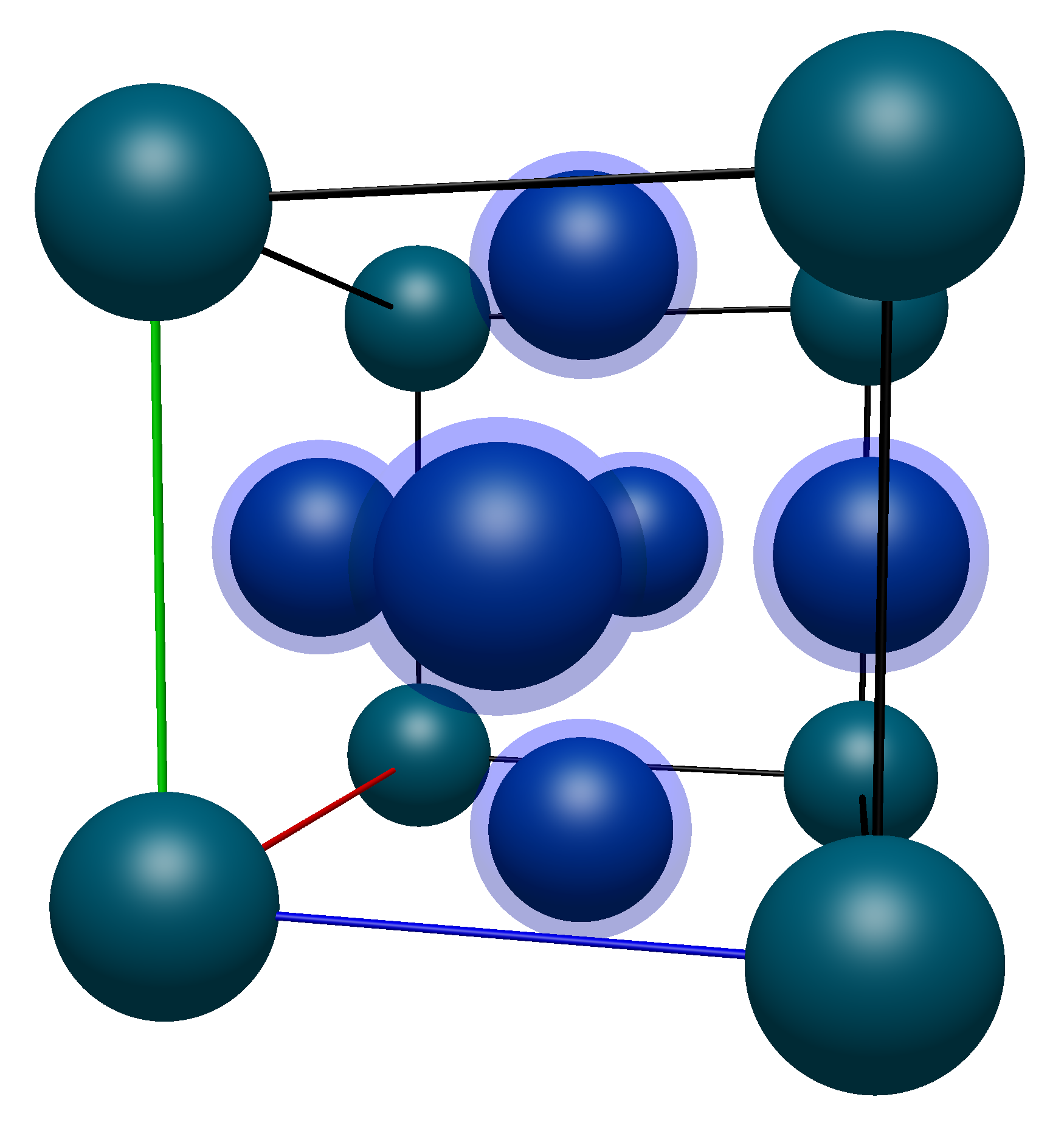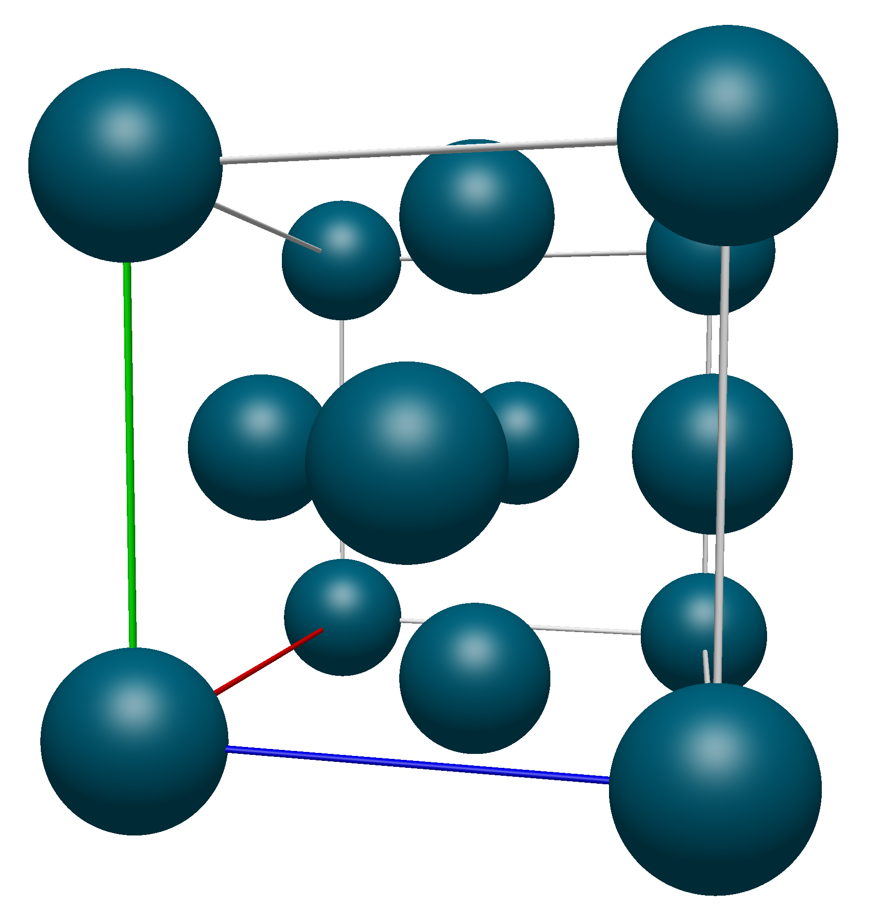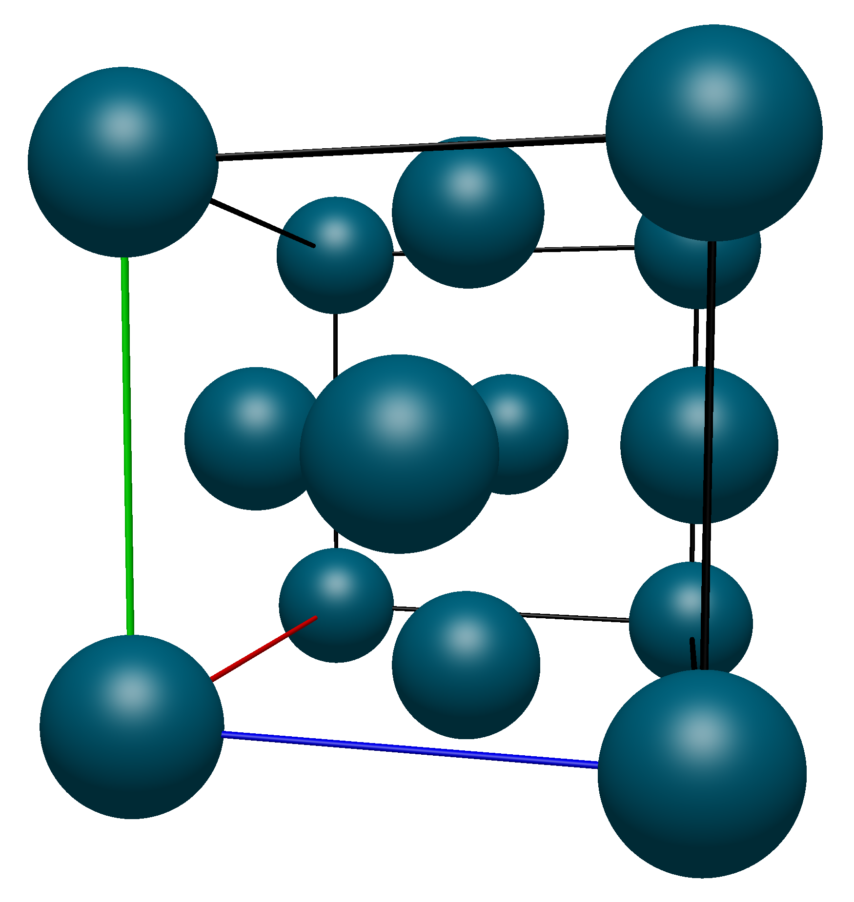 As a visual demonstration of this, consider a the conventional unit cell of Palladium, which has a Face-Centered Cubic crystal structure. Below we show the unit cell produced with the Fill Unit Cell command and the unit cell matrix (\(\mathbb{A}\) from above):