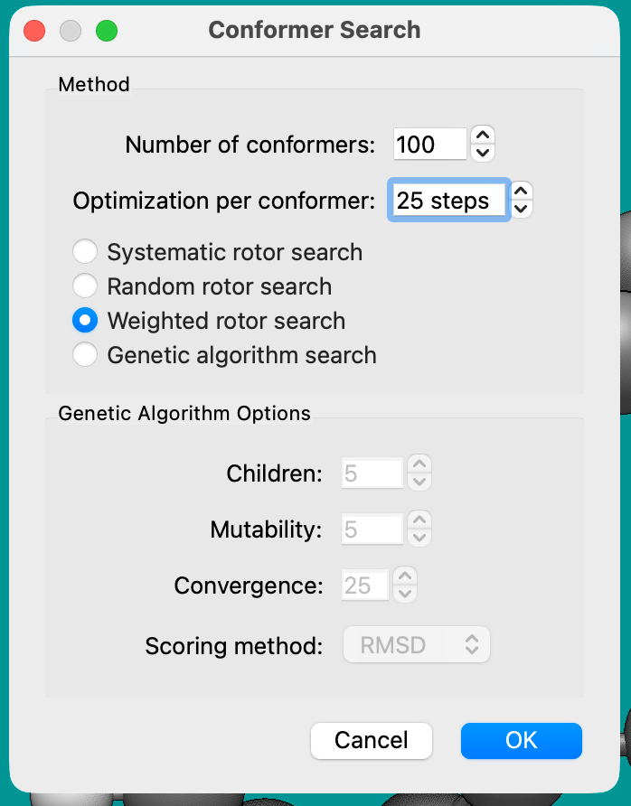 If you pick a Weighted Search, set the number of conformers to test (e.g., 200-500).