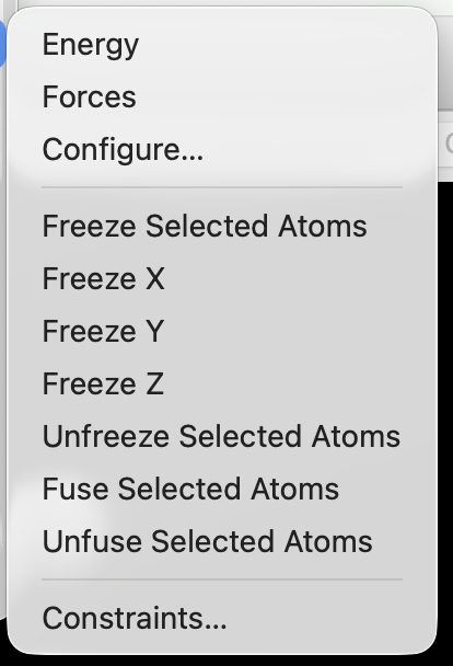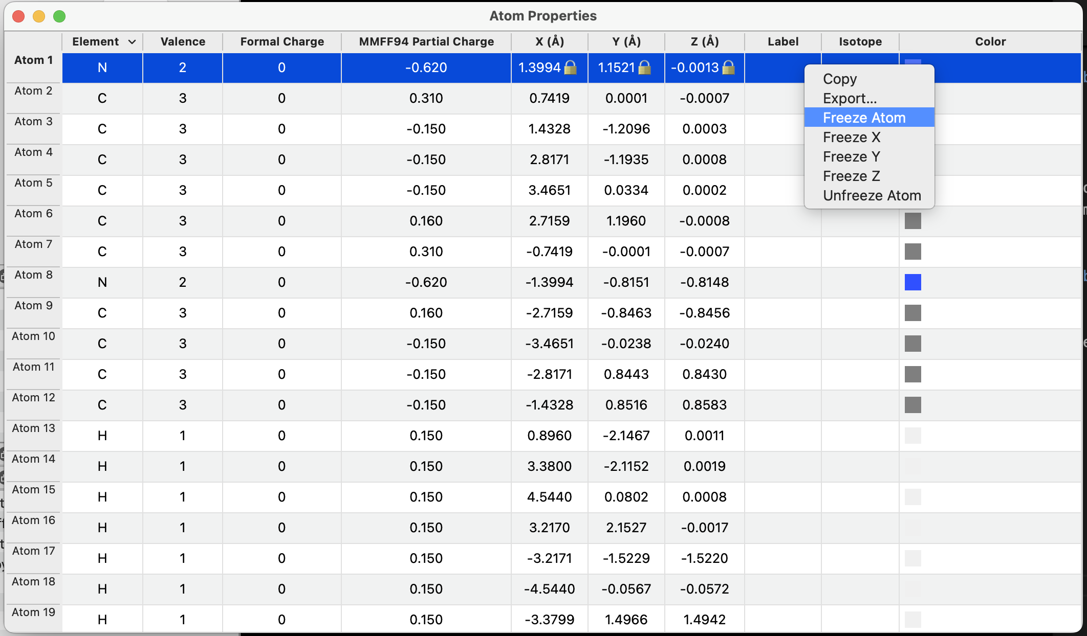 Right clicking the dialog will bring up a contextual menu to add or remove constraints on a given atom.