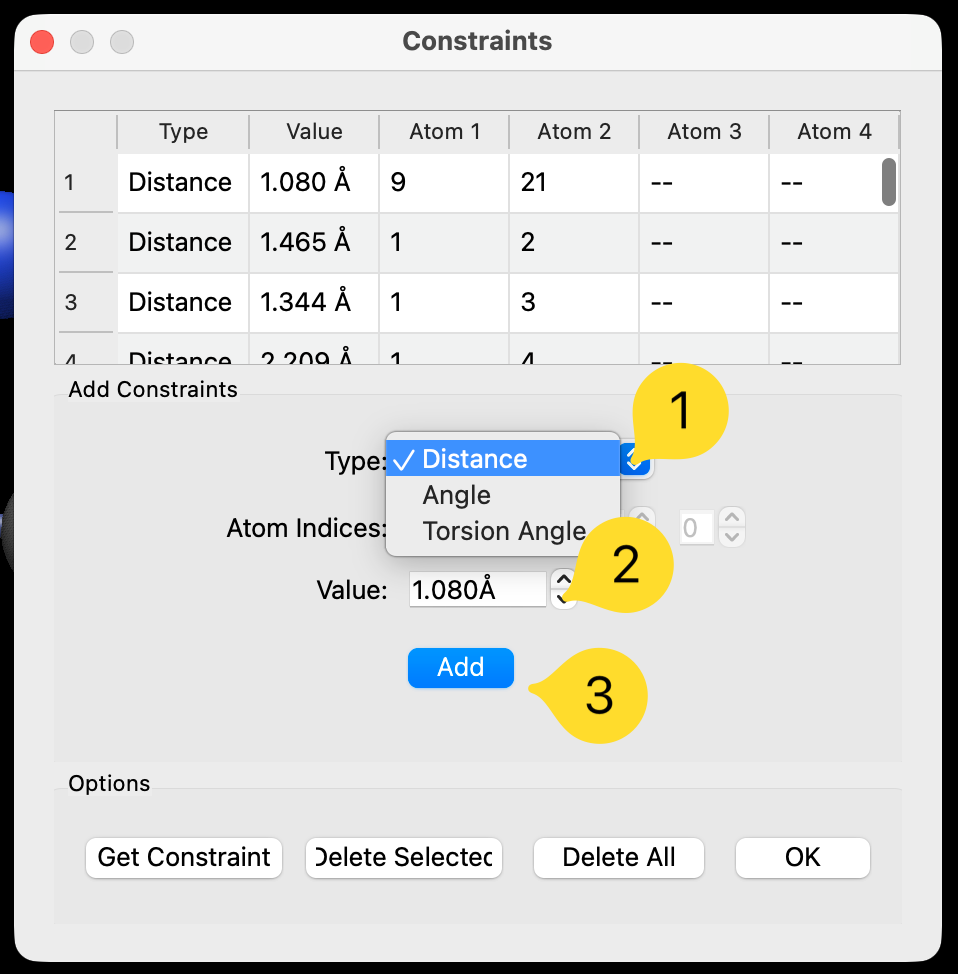 By default, the dialog will recognize that there are two selected atoms for a distance constraint, and you can adjust the type, value, and click “Add” to create the distance constraint.