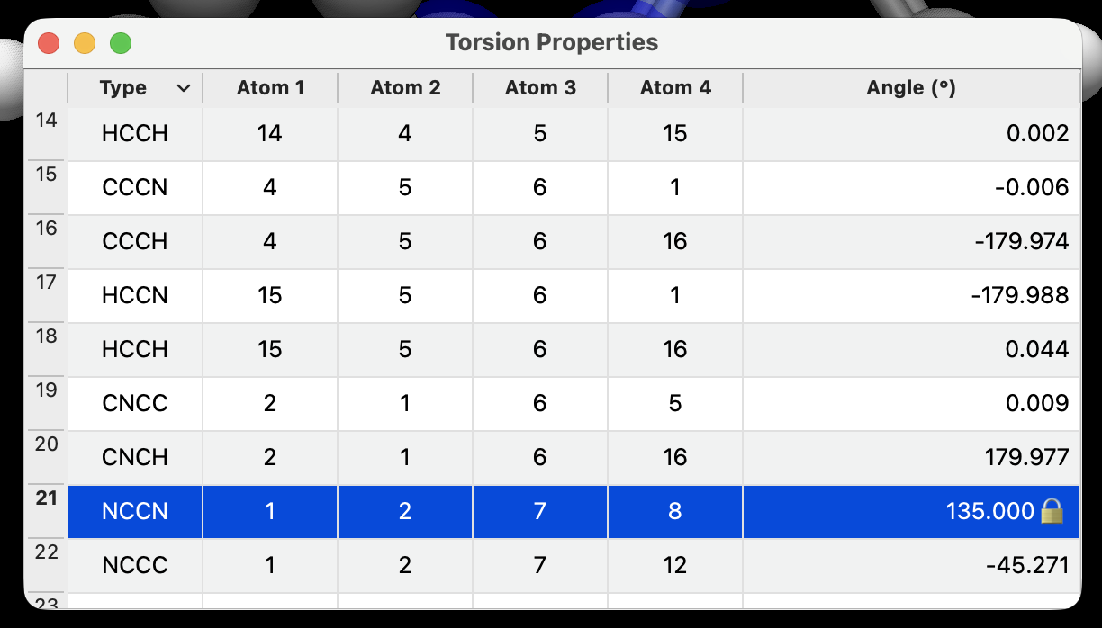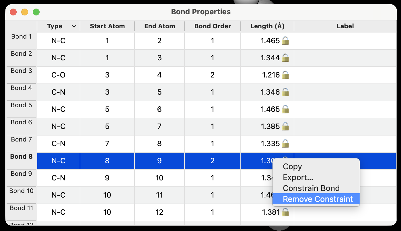 Similarly, distance constraints for bonds are obvious in the Bond Property dialog and the bond length is indicated with a 🔒.