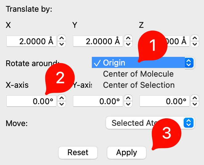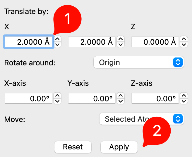Specify the distances, in angstrom, to shift the selection along the X-, Y-, and Z-axes.