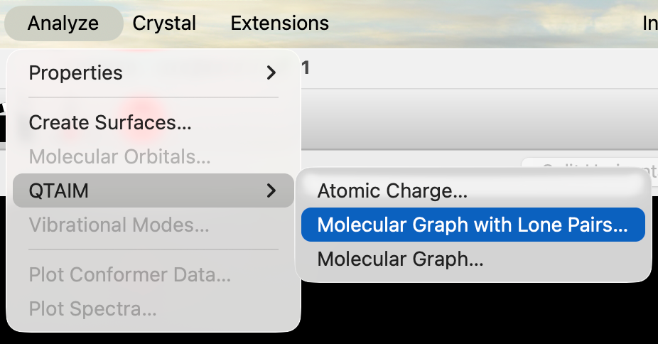 Here, we’ve enabled the QTAIM display, which will show lone pairs, bond critical points, etc. You may also want to turn off the Ball and Stick model to see all AIM annotations.