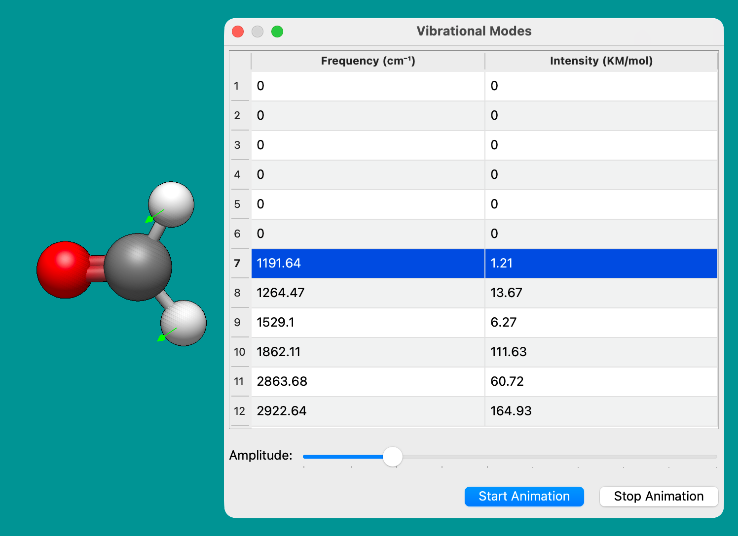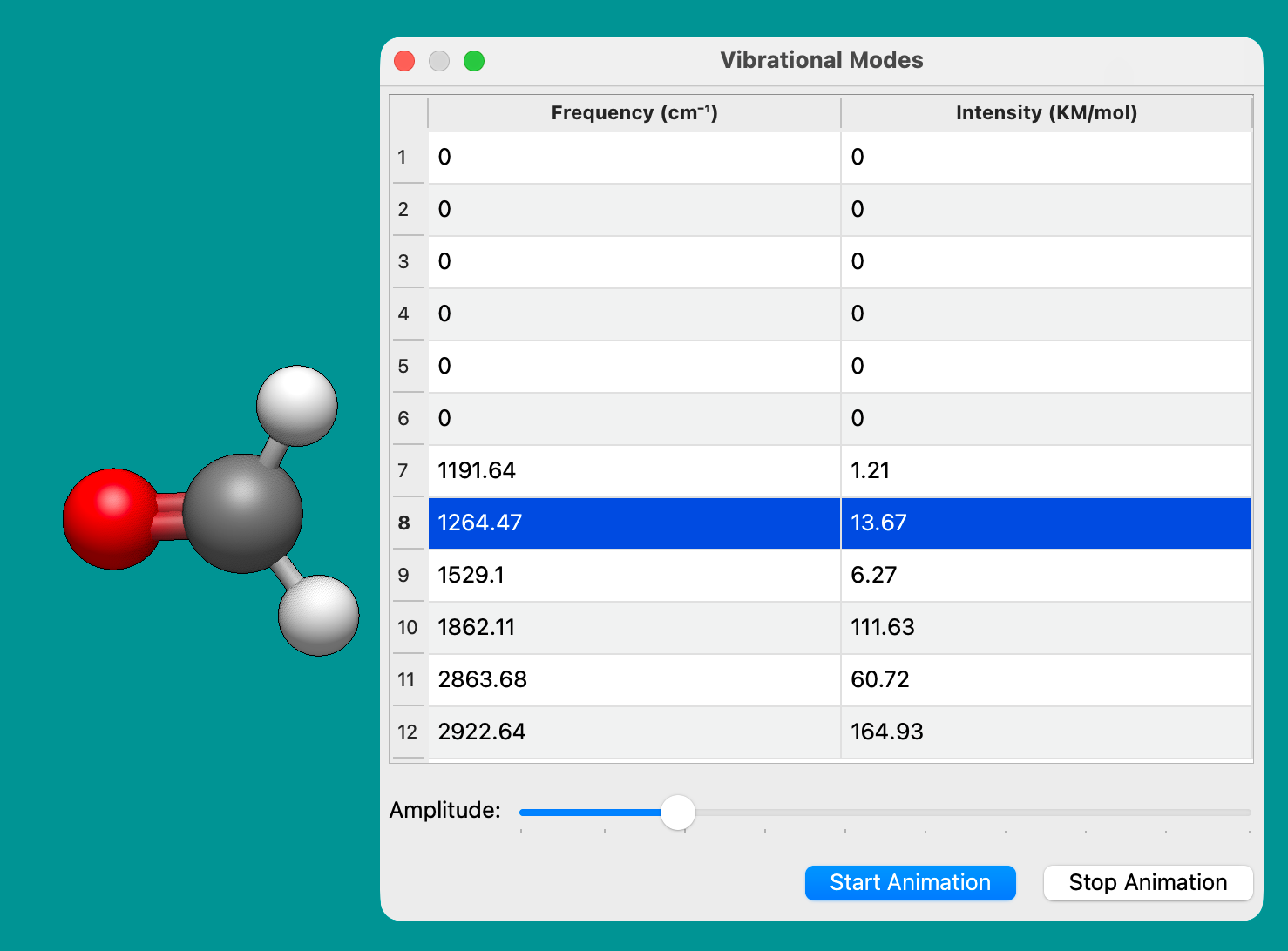 This feature allows visualizing vibrations from a “frequency” calculation with quantum chemistry codes (e.g., Gaussian, ORCA, Q-Chem, etc.)