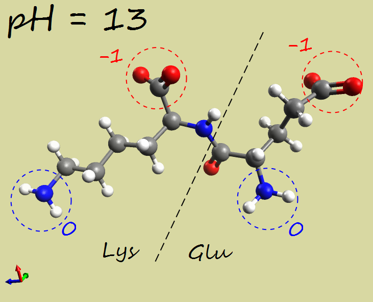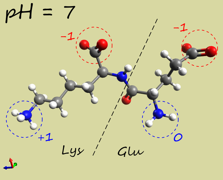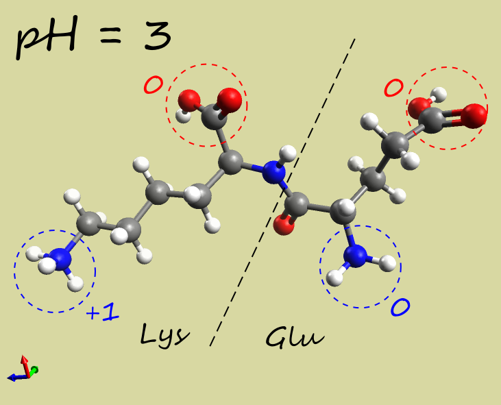 In a new View, create a (glutamic acid - lysine) dipeptide using the “Build” menu, then “Insert”, then “Peptides…”. Set the pH to 3 and calculate the corresponding electrical charge of the dipeptide. Do the same for pH 7 and pH 13.